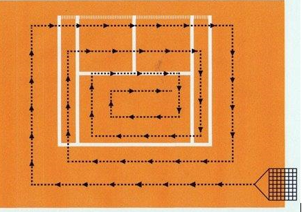 Keer de velden in cirkelvorm van buiten, startend buiten de buitenlijn, naar binnen; en eindigend aan de opslagplaats (in het midden).
