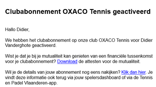 Eens de betaling van je lidgeld door de club is verwerkt, krijg je een mail dat je clubabonnement is verwerkt met een link naar je attest mutualiteit.
