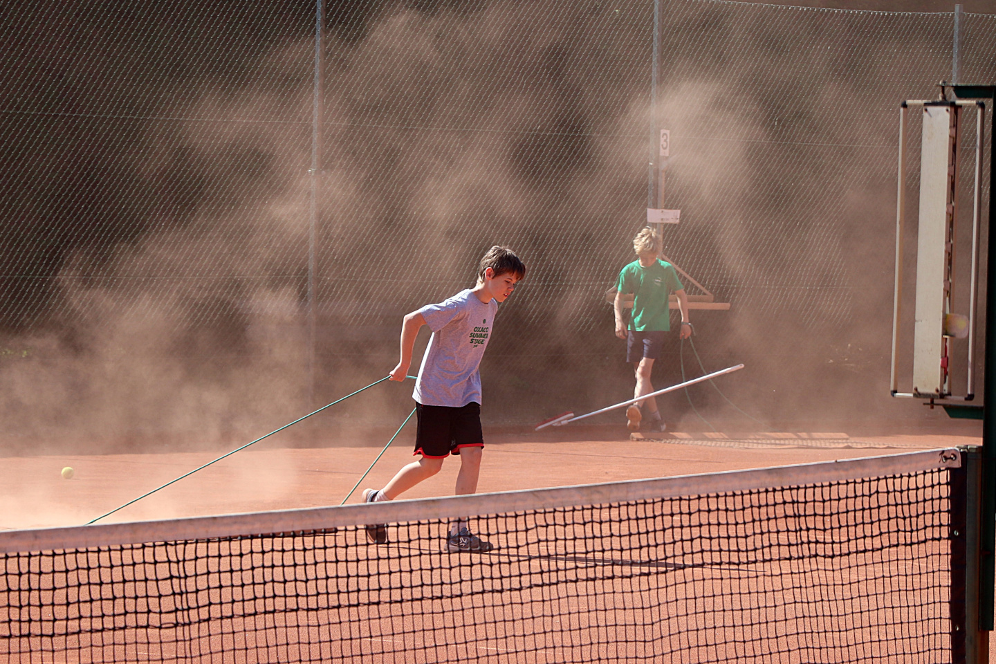 Keer na het tennissen het terrein, met de sleepnetten of de (grote) keerborstels. Keer ook het deel buiten de terreinen en ook de strook tussen de terreinen. Zo voorkomen we mos- en grasgroei.